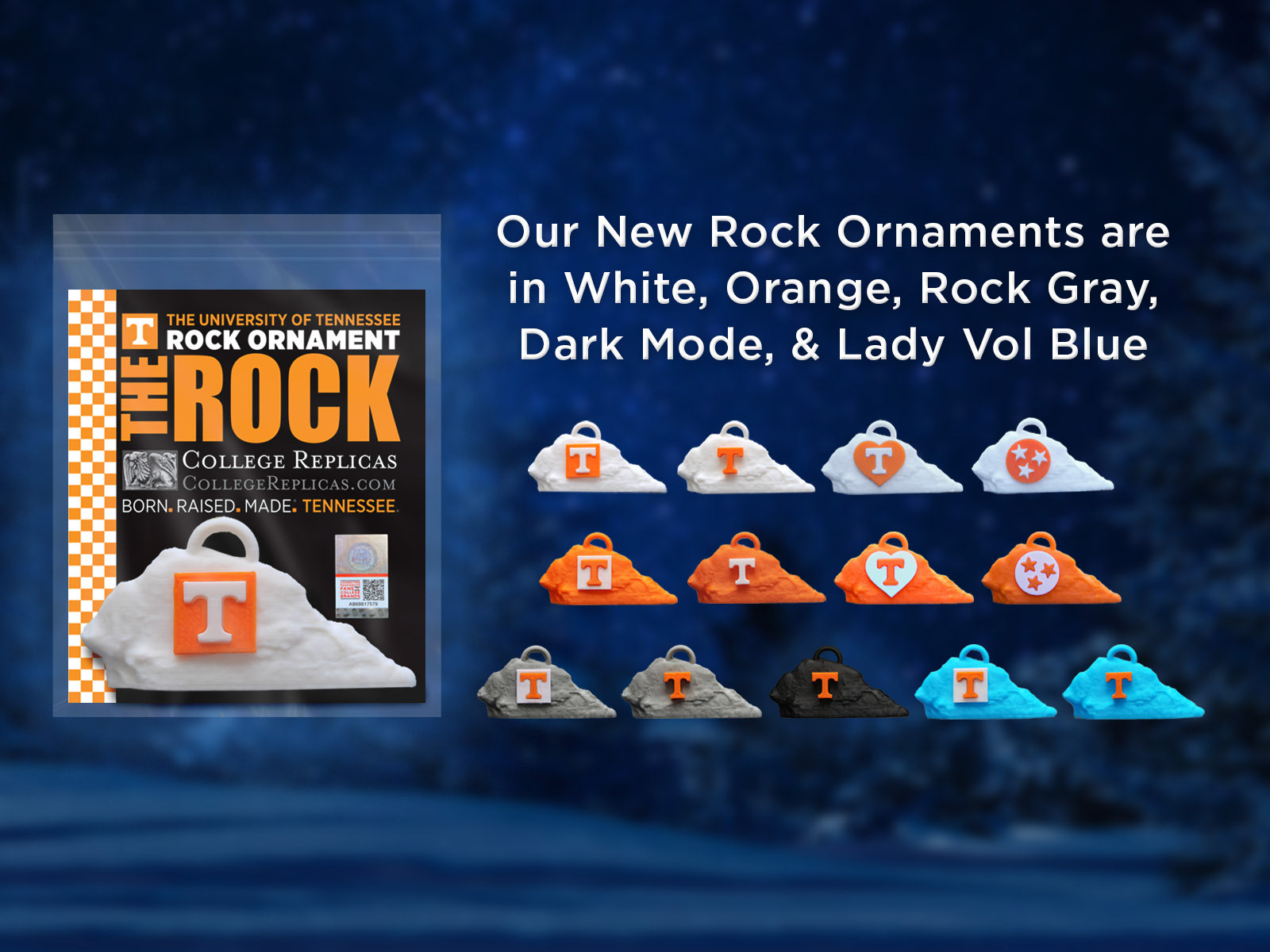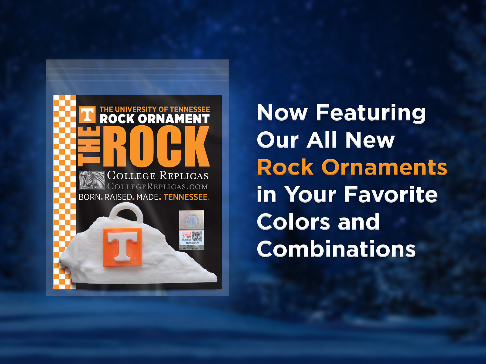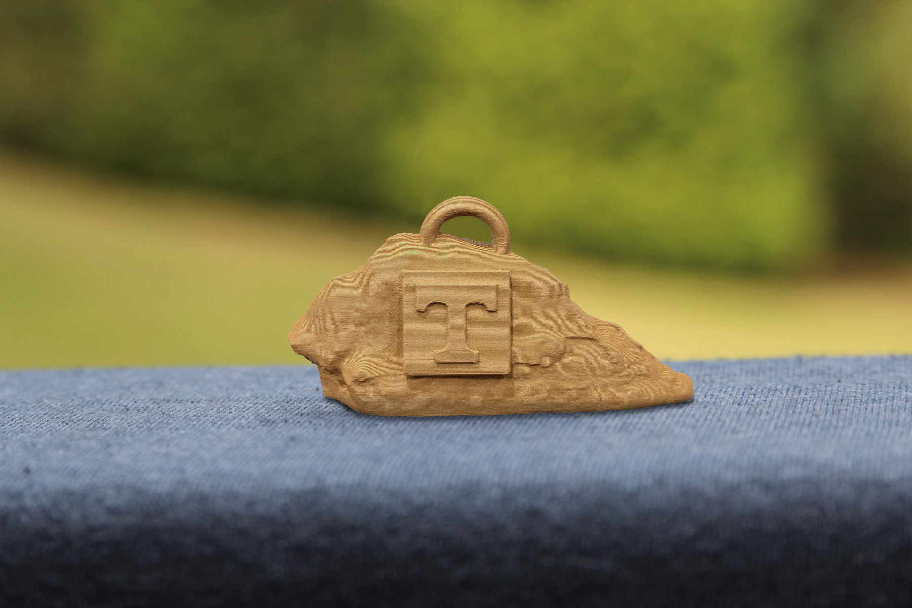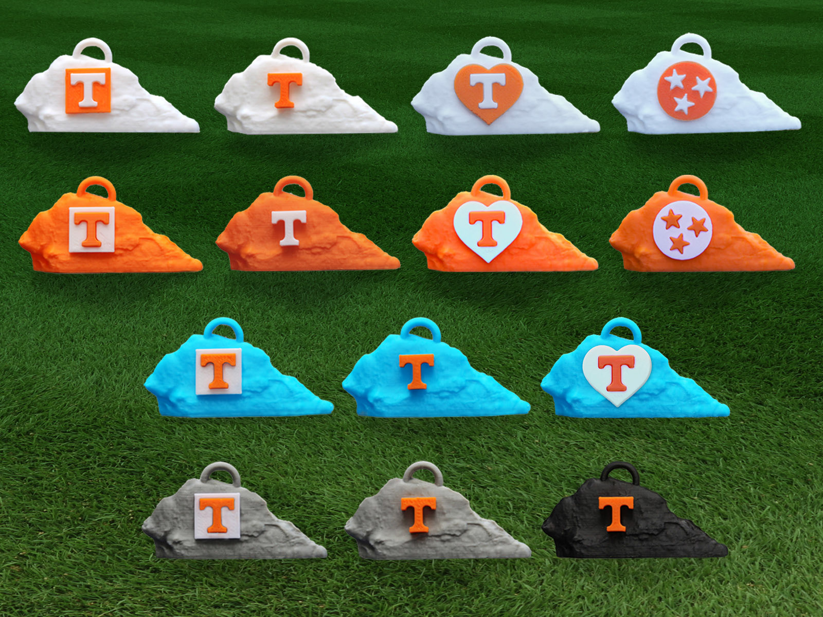 The University of Tennessee Rock replicated as a holiday ornament. Branded colors. Peg system to attach various color combinations with a single color 3D printer.