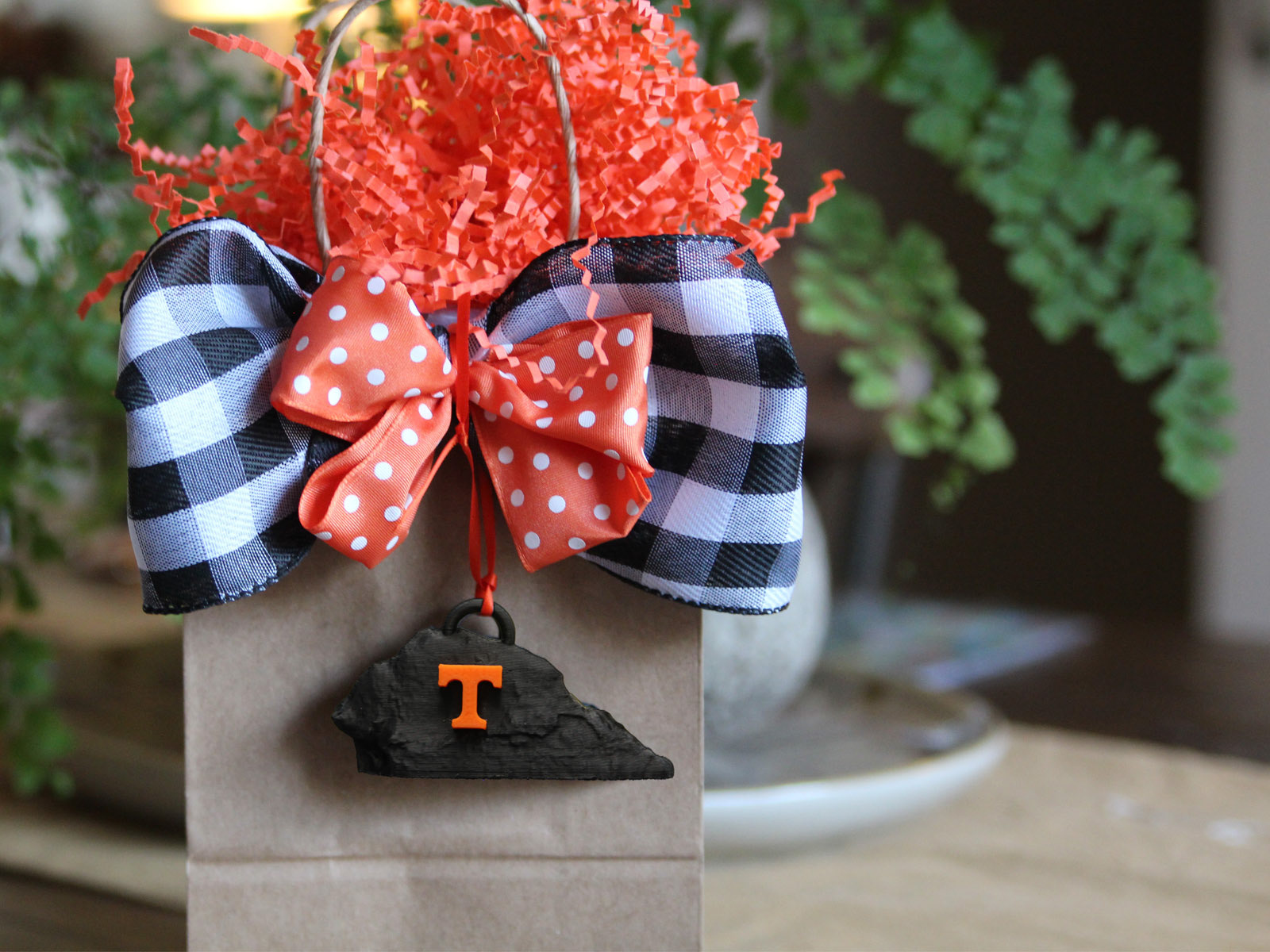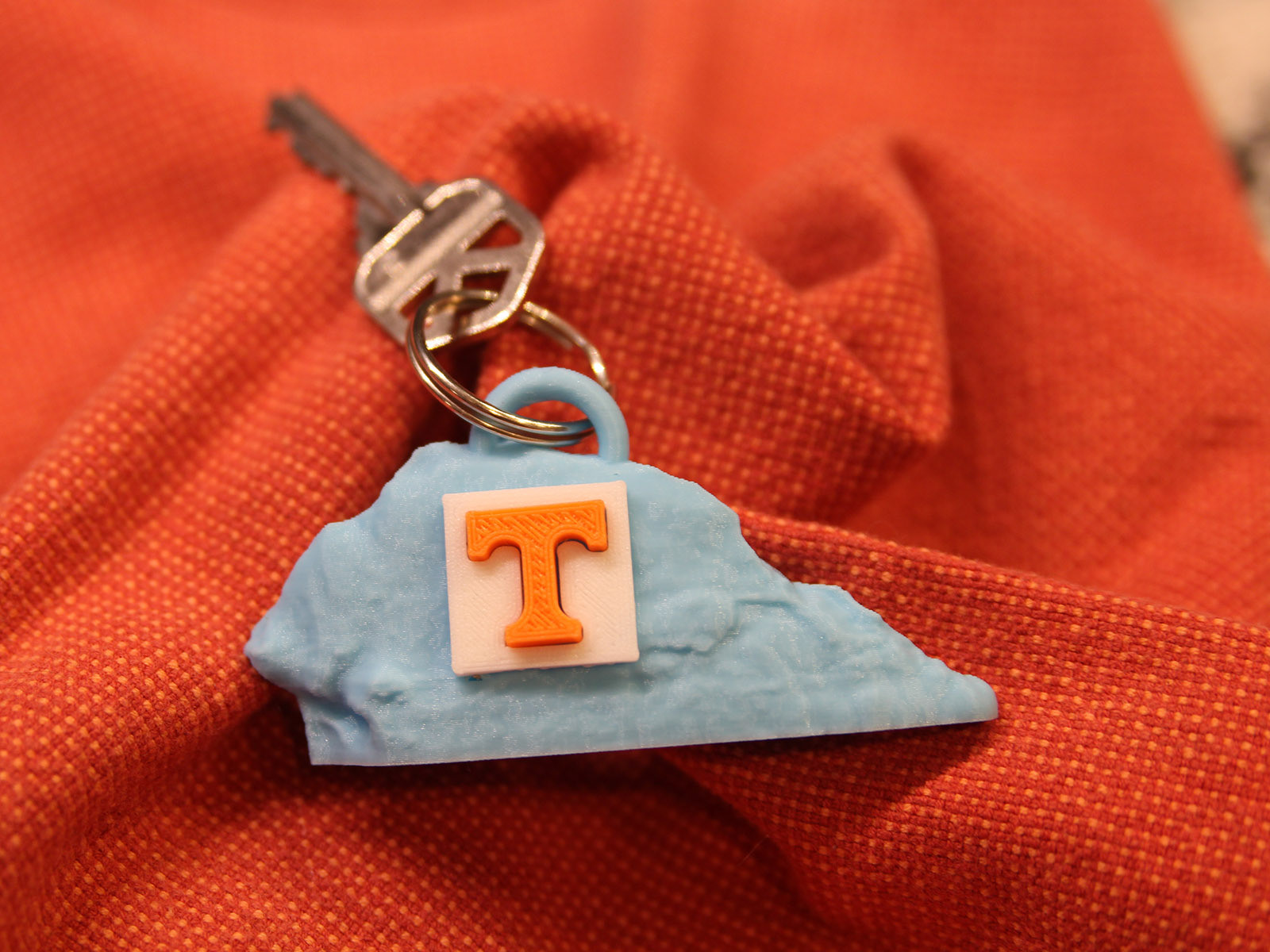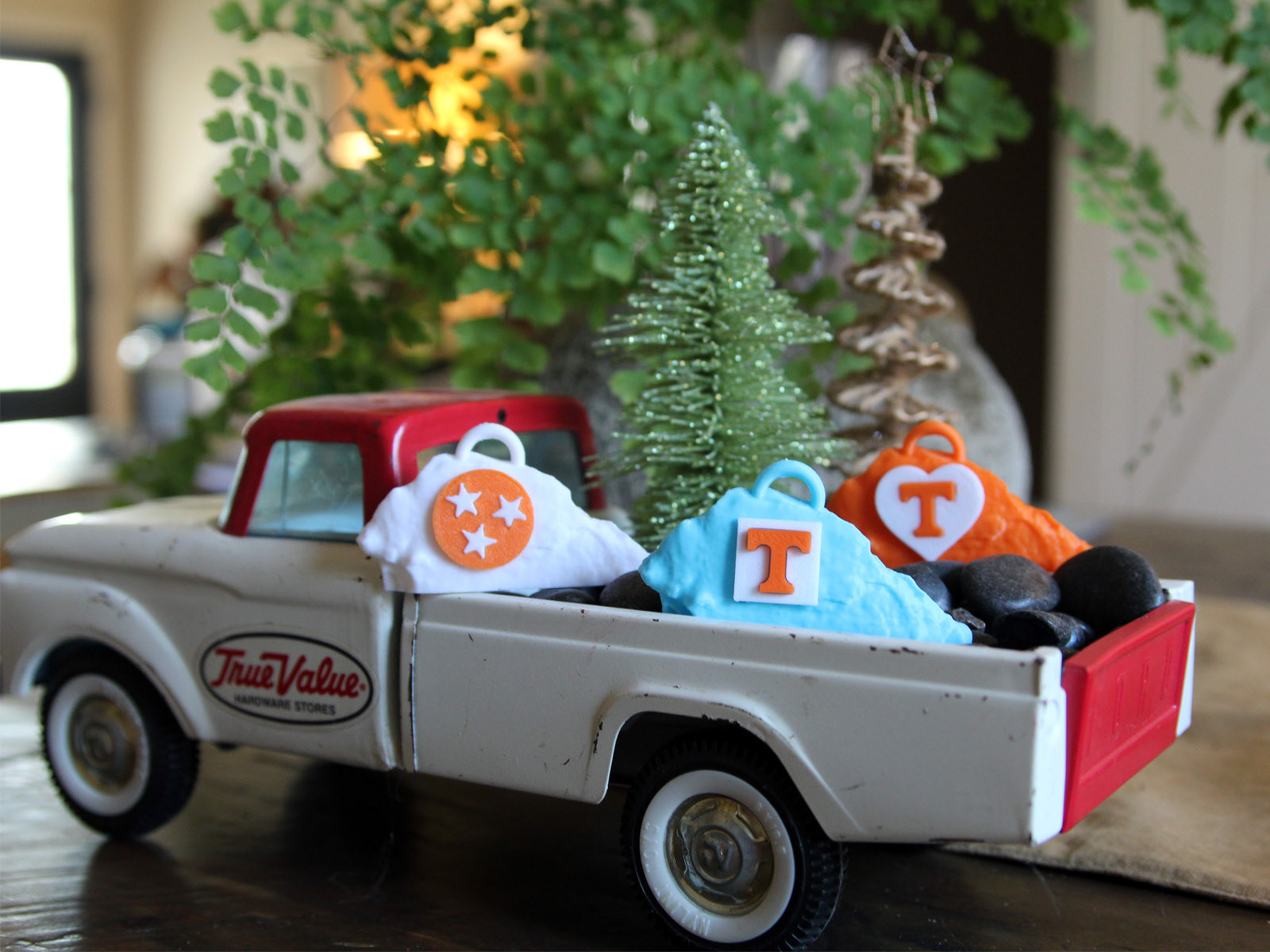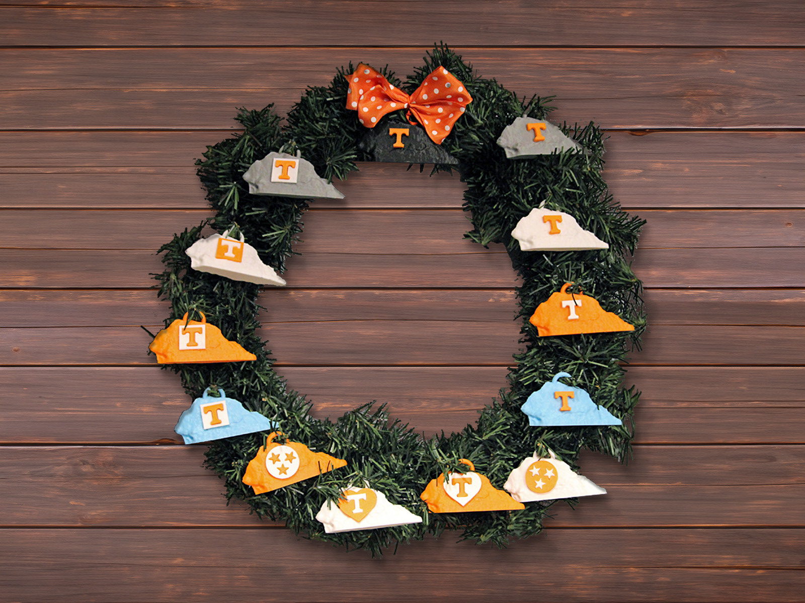 The University of Tennessee Rock replicated as a holiday ornament. Branded colors. Peg system to attach various color combinations with a single color 3D printer.