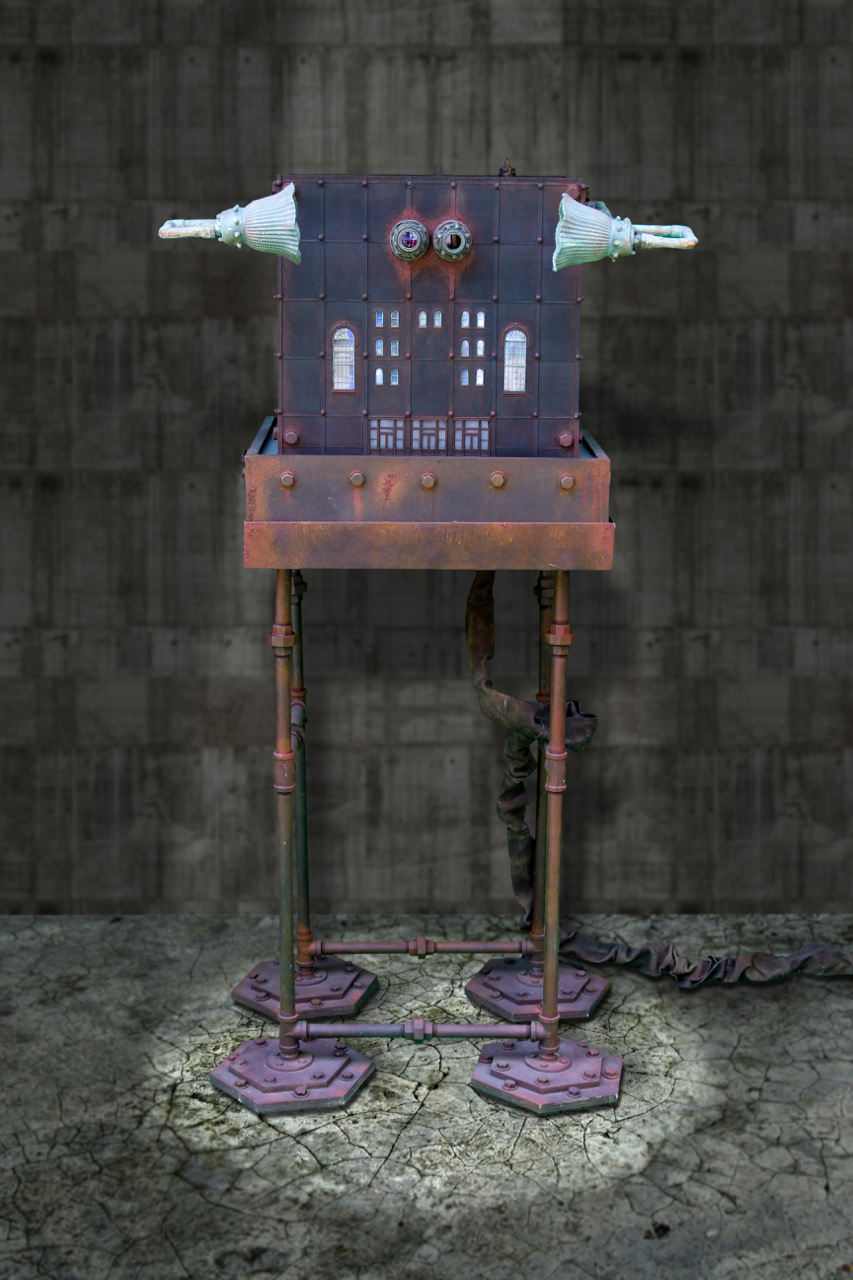 A Personalized Political Indoctrination Device. Multimedia sculpture includes video animation with audio taken from radio and TV recordings of political media figures. With any new animation and recording the sculpture becomes an entirely new piece.