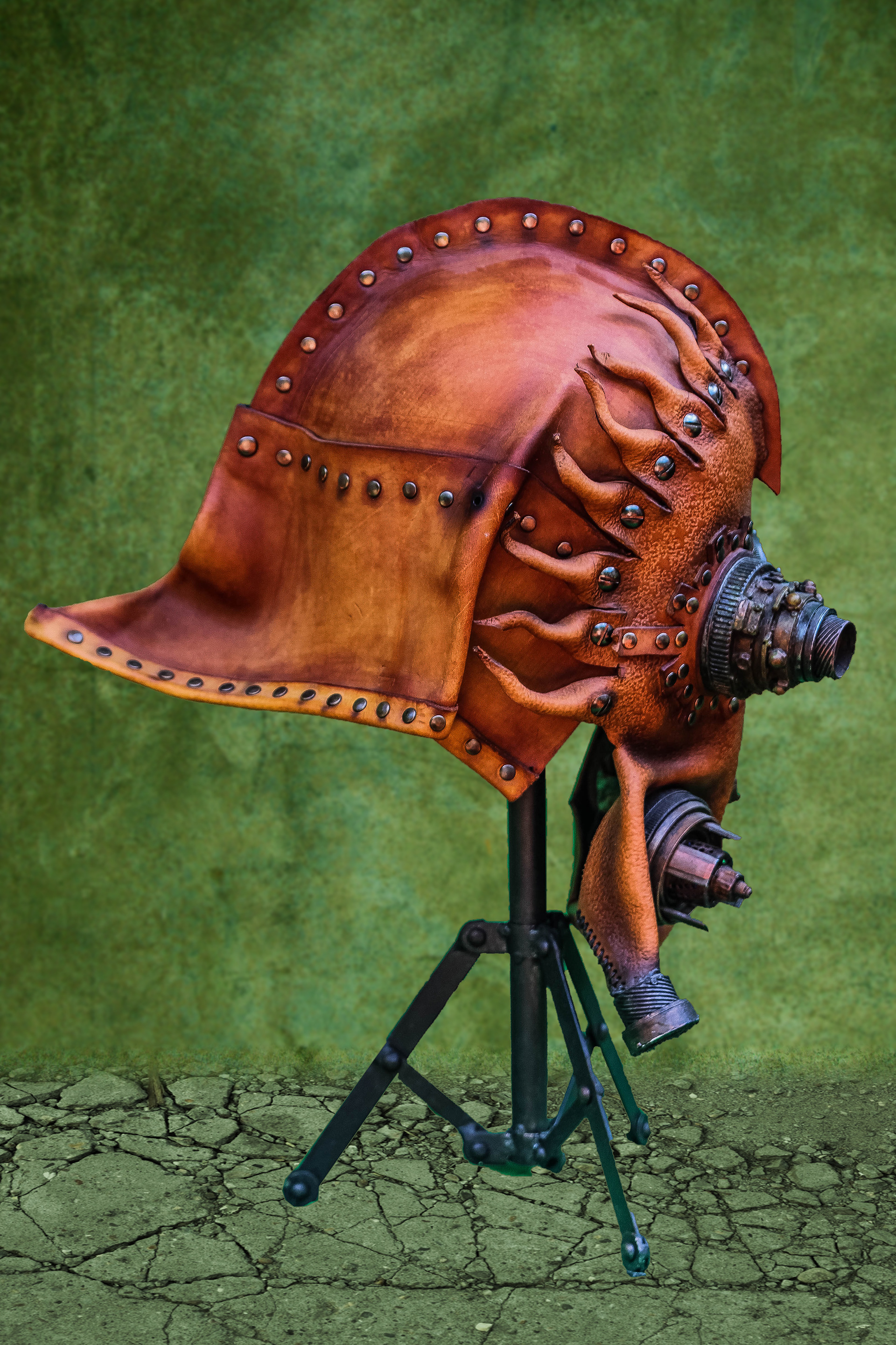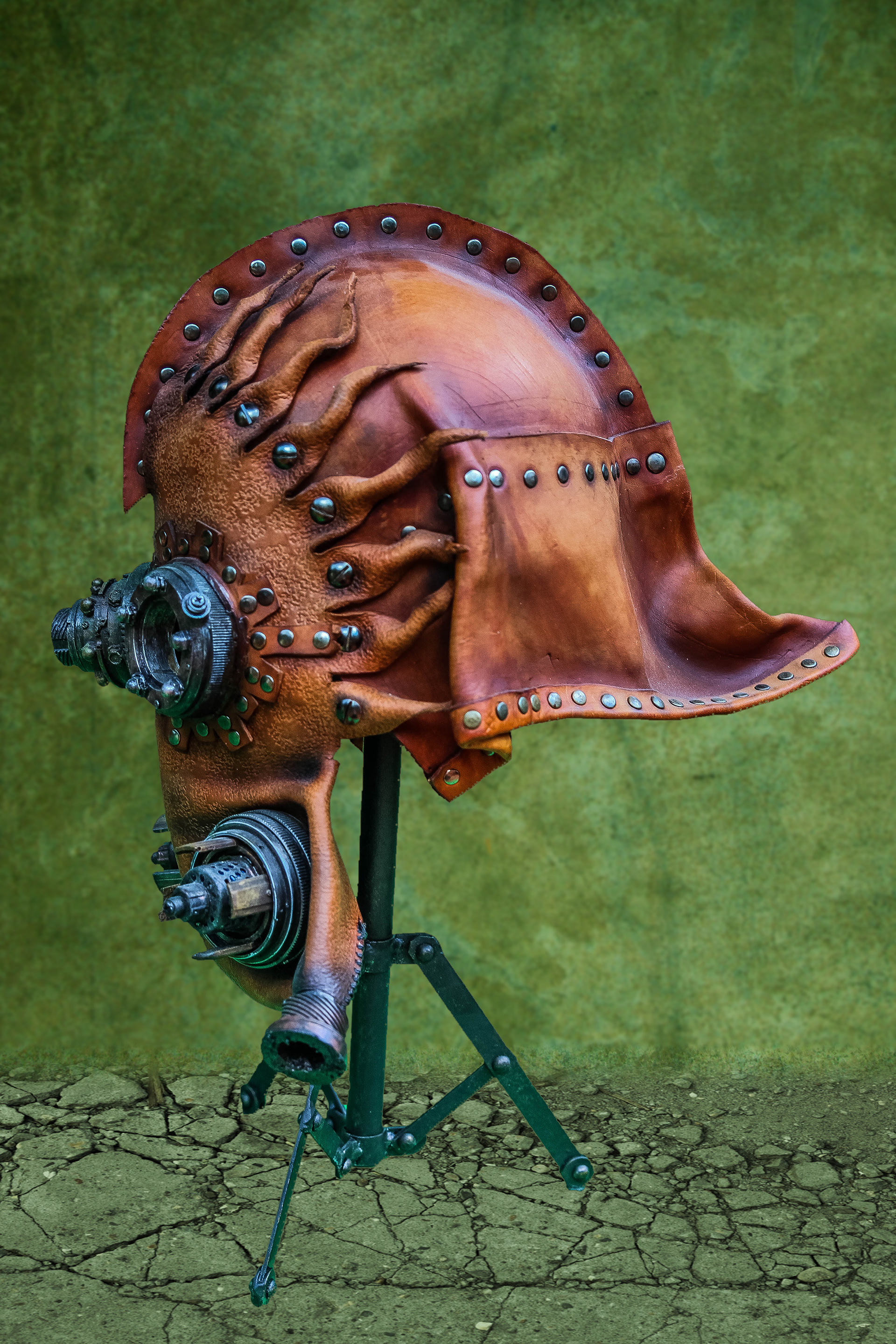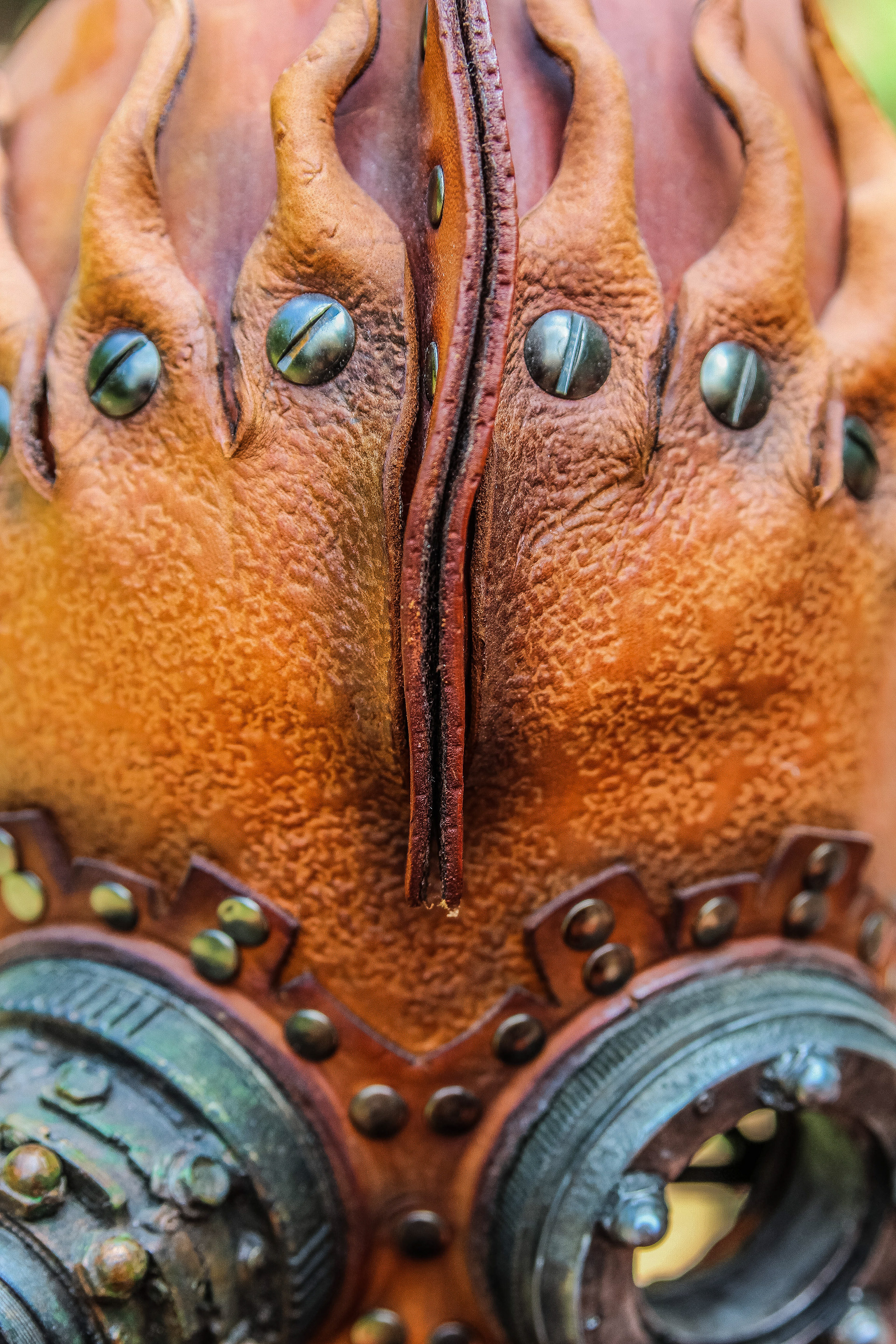 Leather Steampunk Mask (Leather, Dyes, Rivets, Cast Urethane Plastic, Waxed Leather Thread, and EL Wire with Battery Pack).