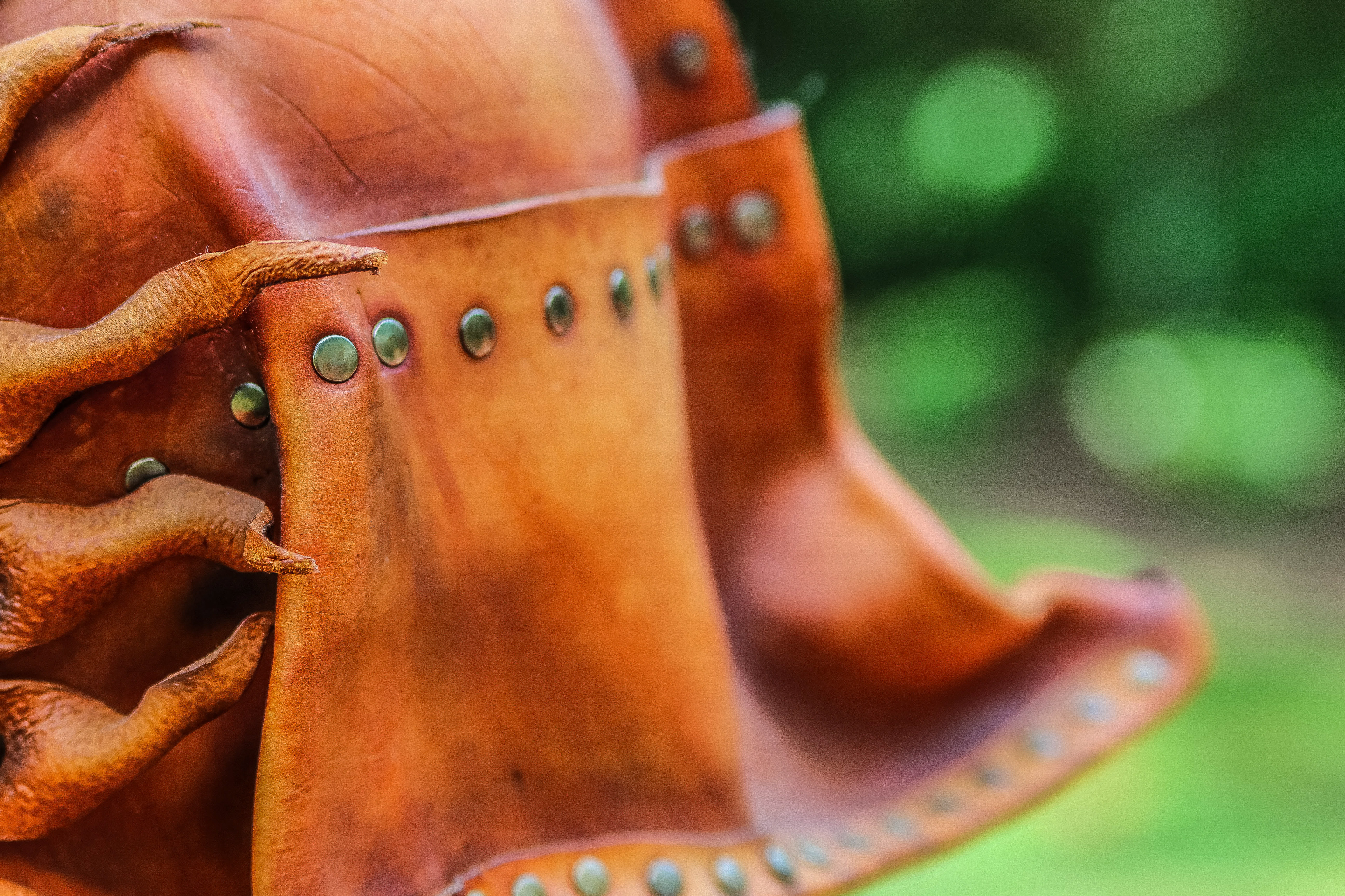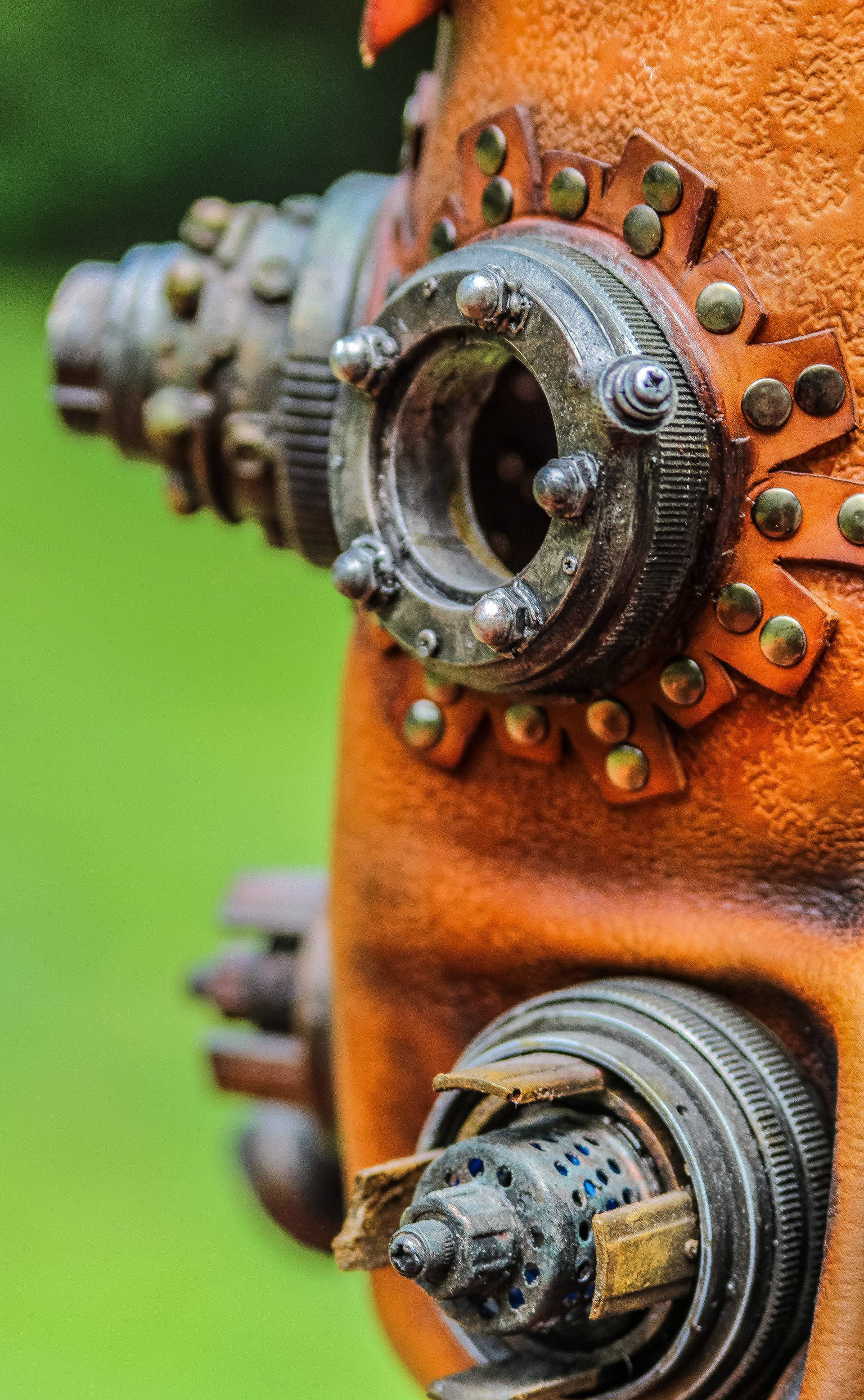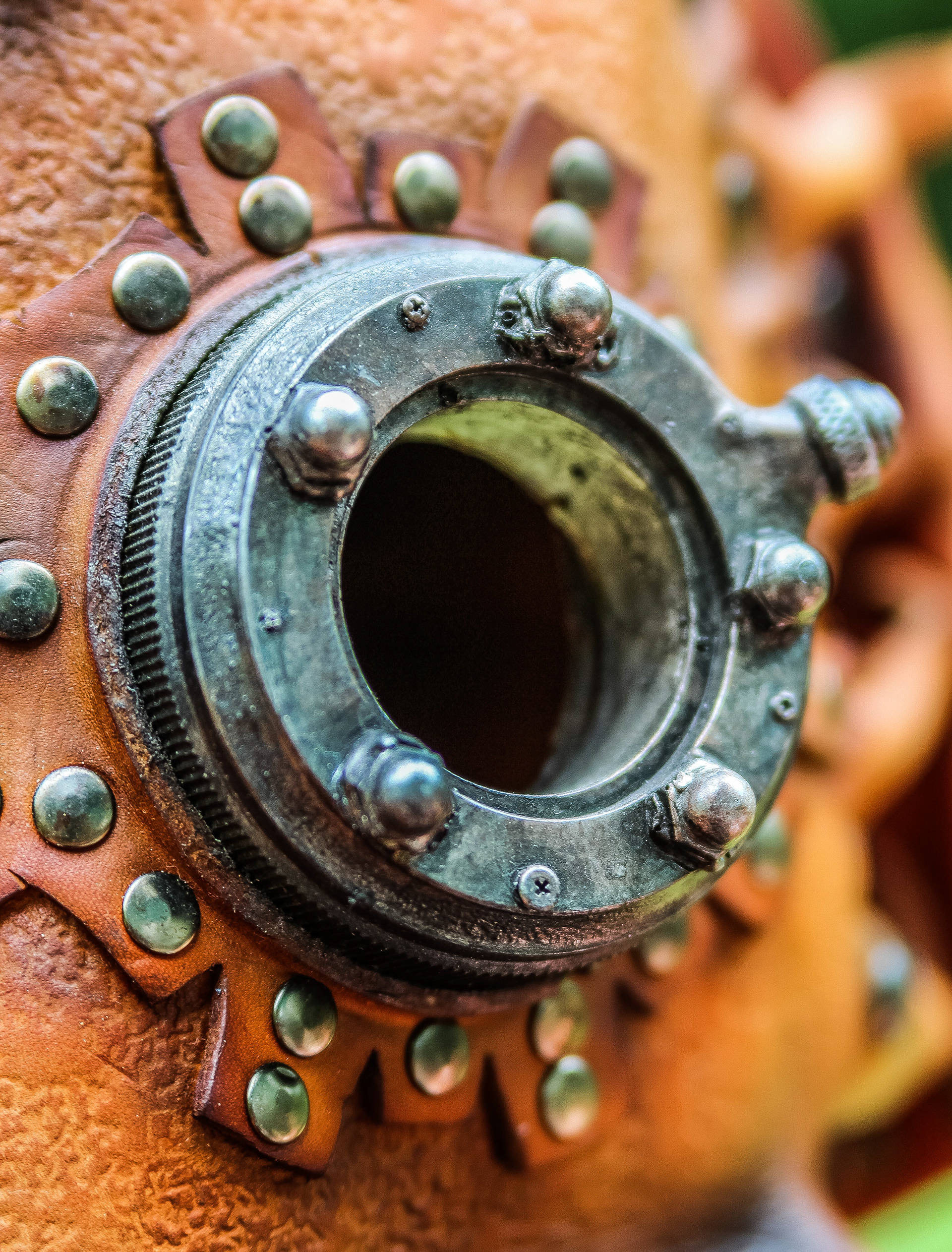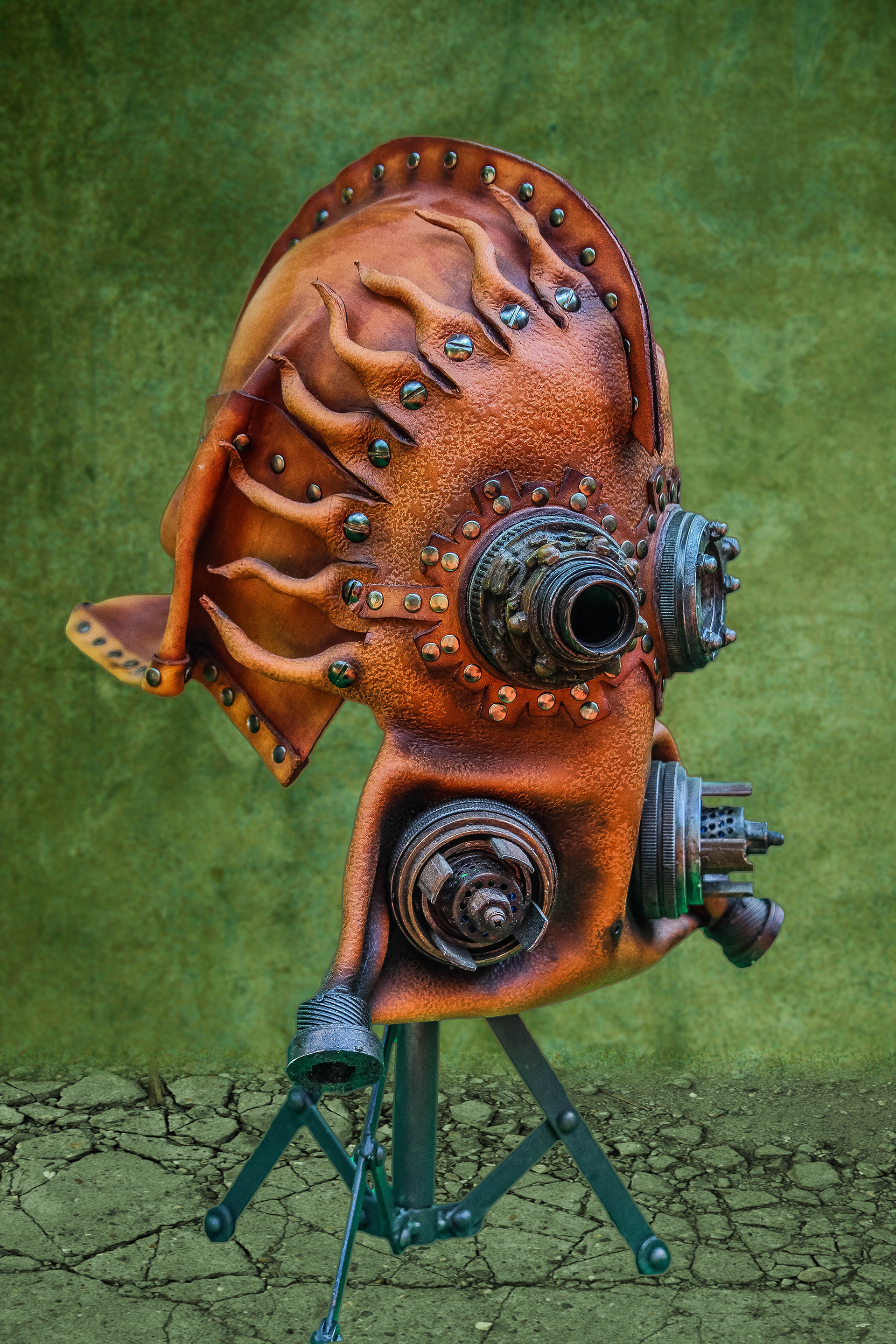 Leather Steampunk Mask (Leather, Dyes, Rivets, Cast Urethane Plastic, Waxed Leather Thread, and EL Wire with Battery Pack).