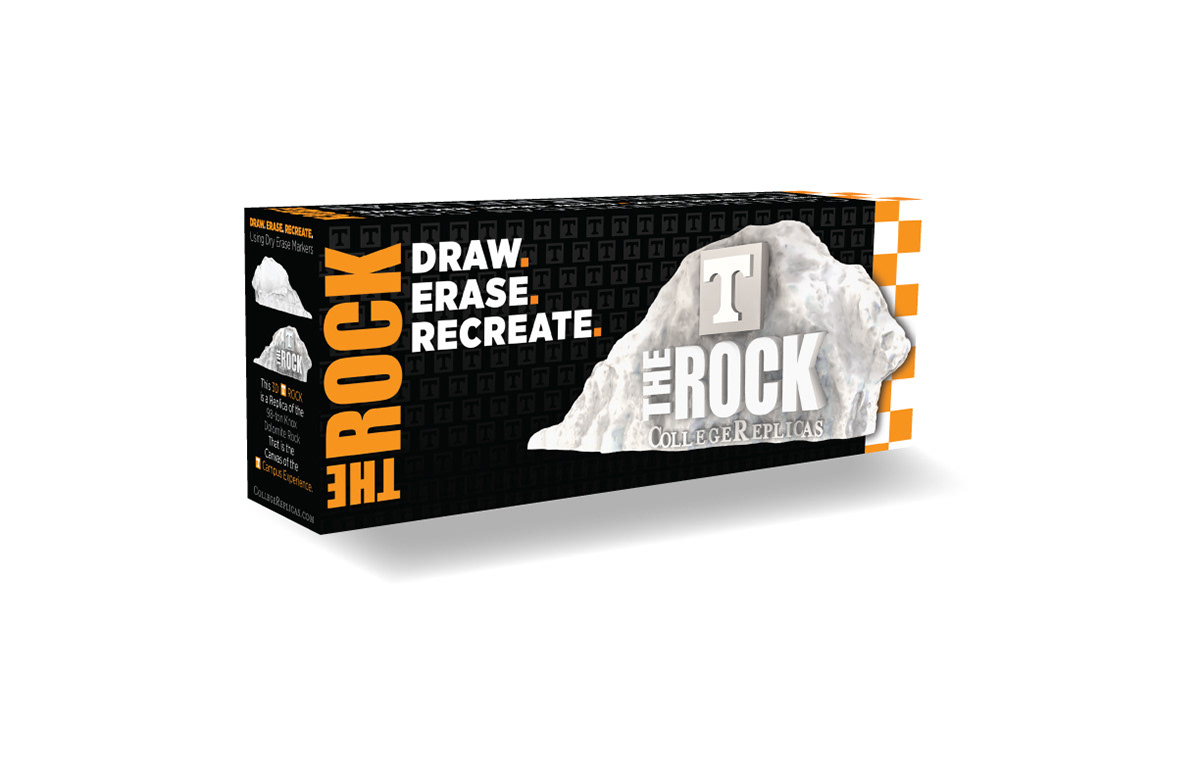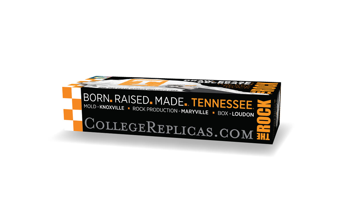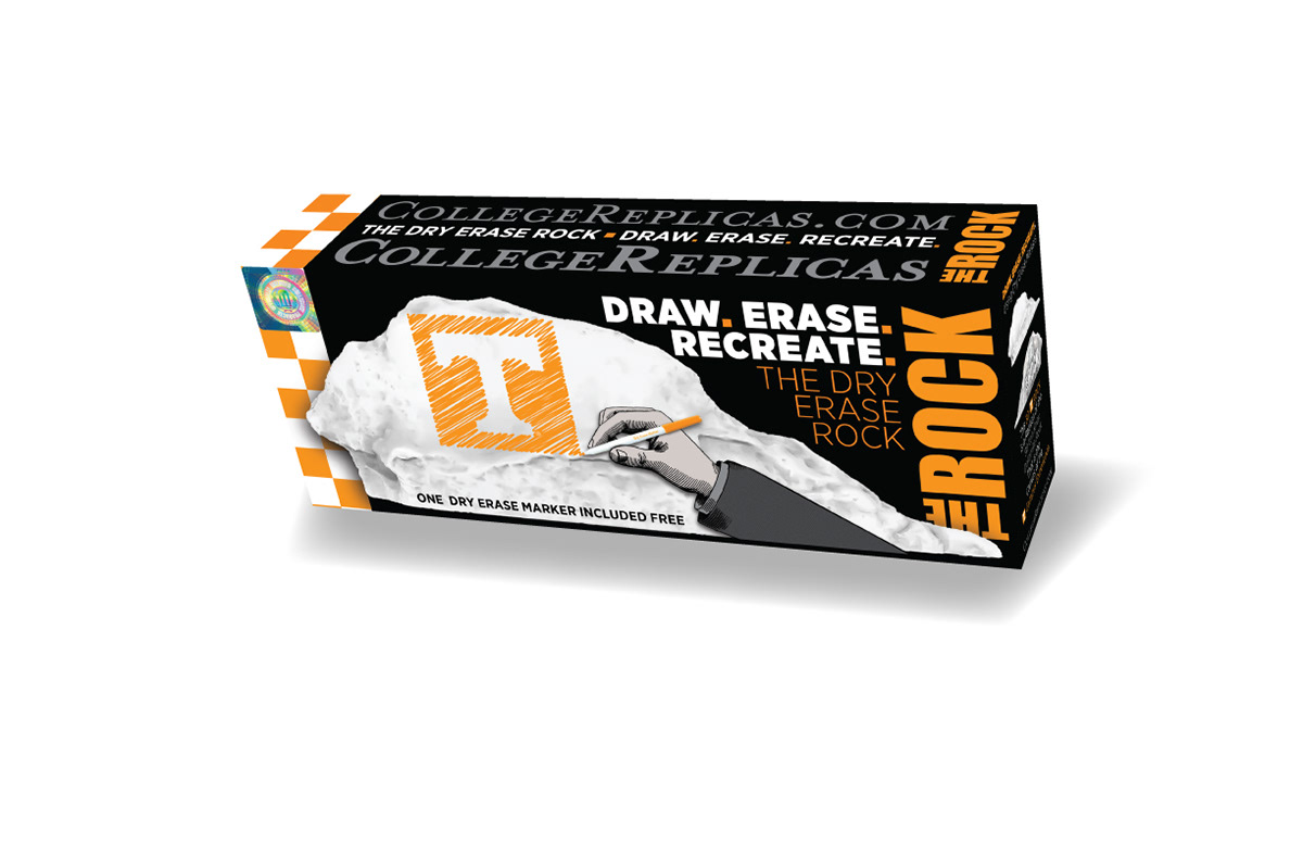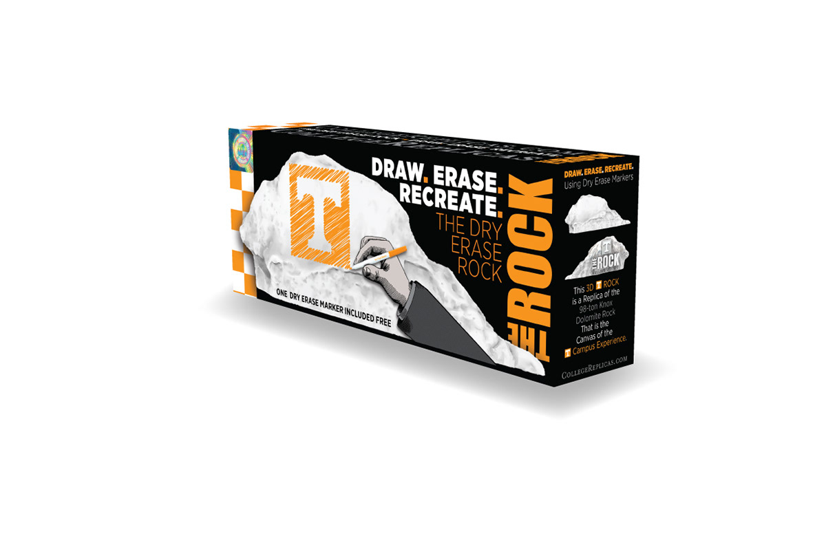 collegereplicas.com theutkrock.com Package design for The University of Tennessee Dry Erase Rock. College Replicas has made a dry erase replica of the University of Tennessee Rock that provides a personal desktop Rock of your own. Cardboard. Adobe InDesign, Photoshop, & Illustrator.