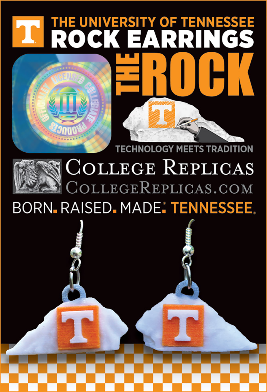 collegereplicas.com theutkrock.com Package & product design for The University of Tennessee Rock Earrings. College Replicas has made 3D Replica Earrings of the University of Tennessee Rock in Sandstone. Volunteer that you are a Vol Fan for Life with these individually 3-D printed Earrings. A perfect replica of “The Rock” with the University of Tennessee logo dangling from your ears tells everyone your Ready for the world! We’re excited to bring you our latest UTK Rock design using the latest technology. 3D color printed in Sandstone. Adobe InDesign, Photoshop, & Illustrator.
